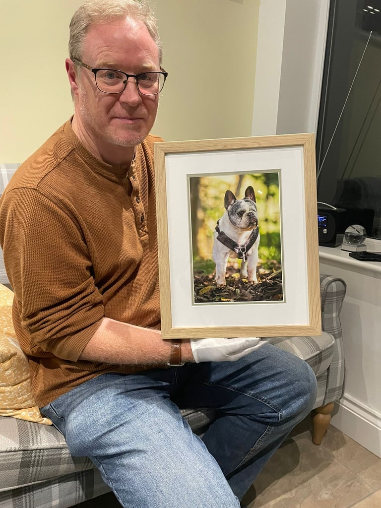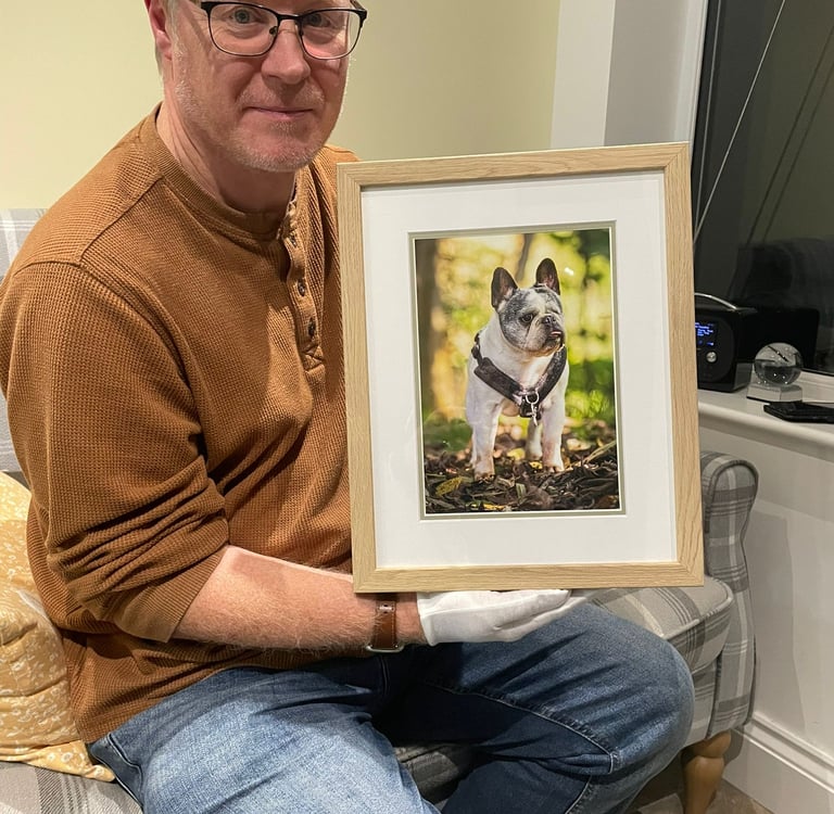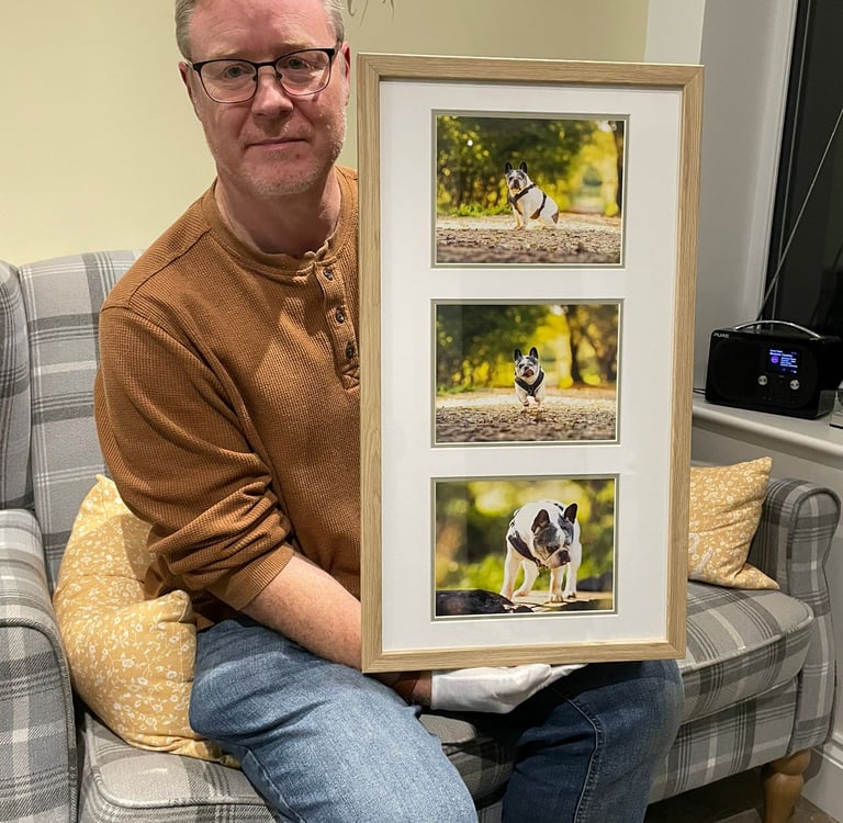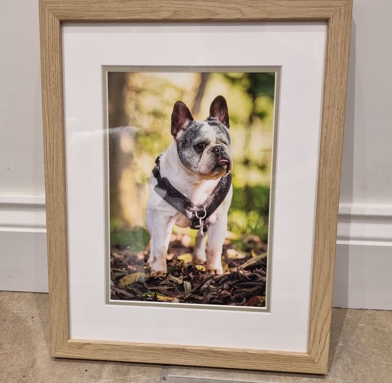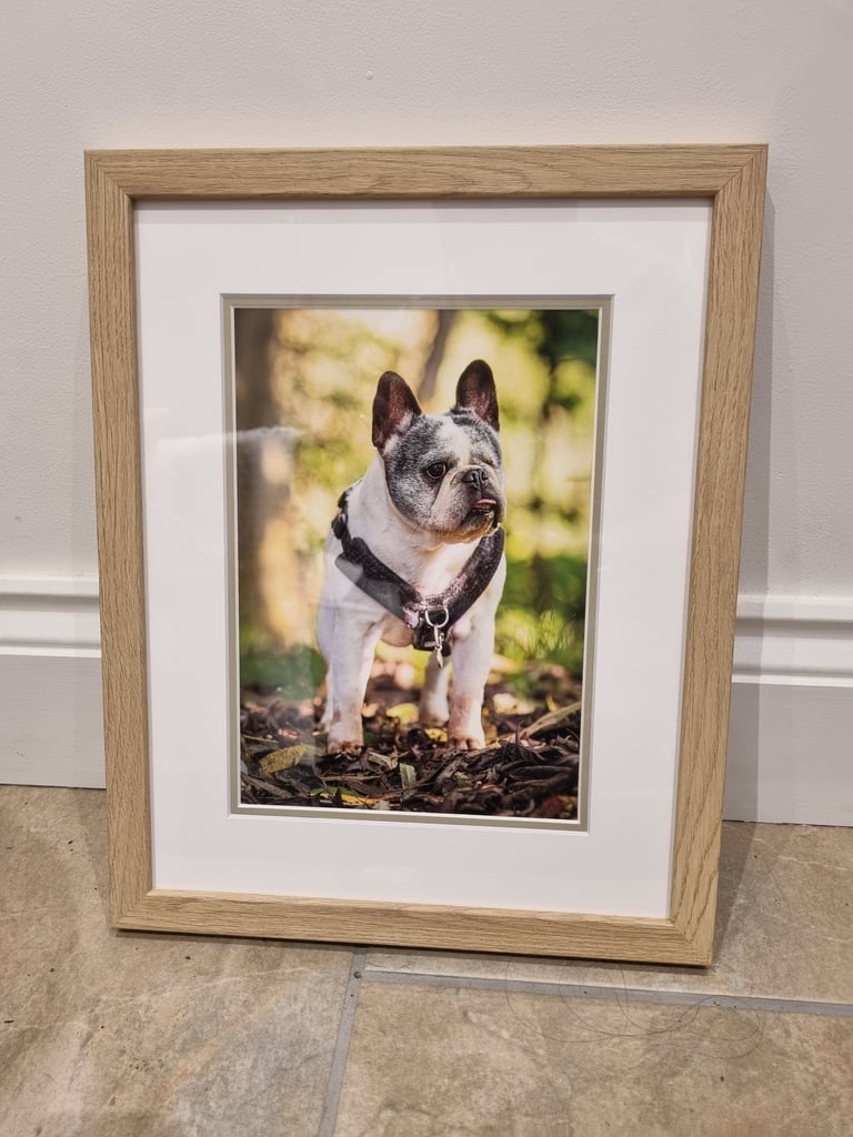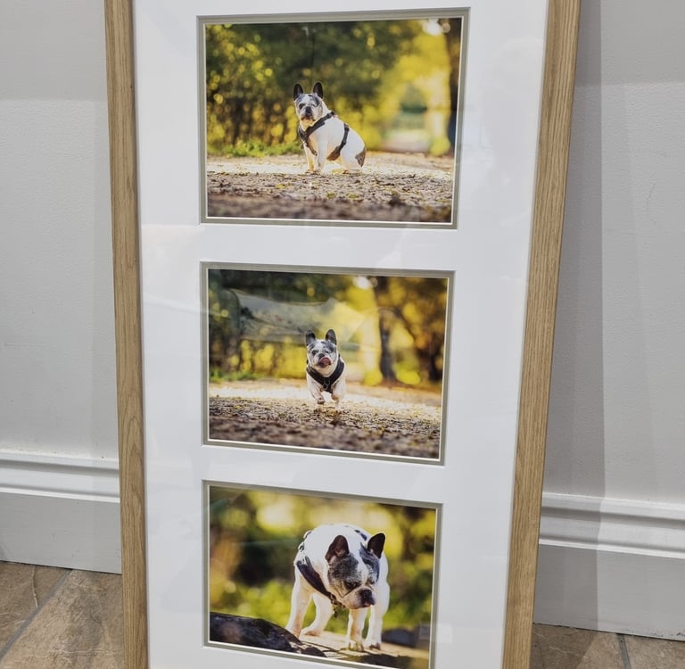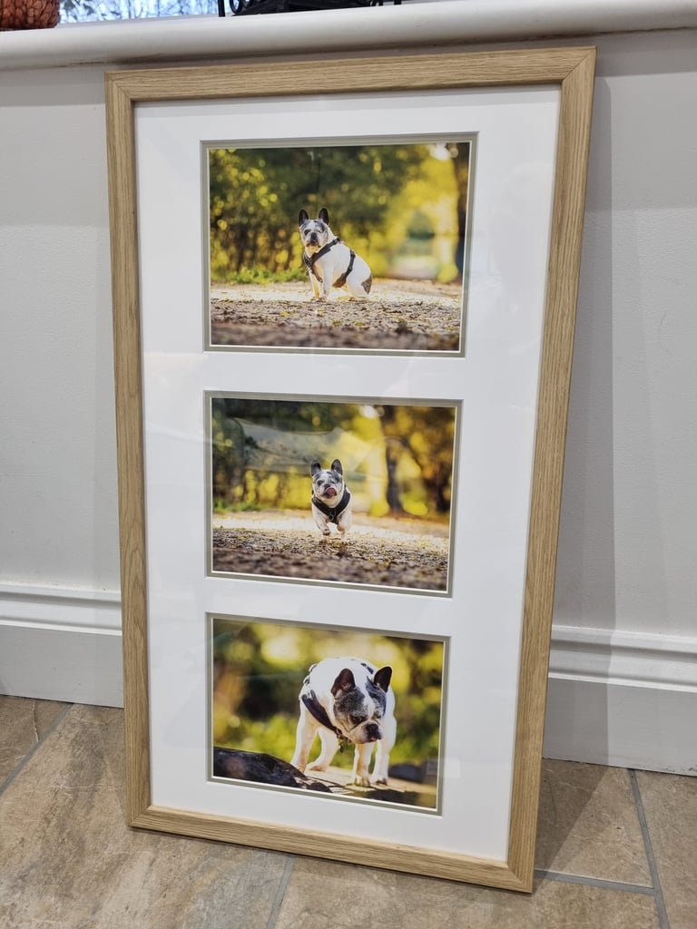 From Shoot to Finished Frames - For this pet pawtrait session, the owners decided to purchase 4 images from the on-line gallery I set up for them. A single image printed on Photo Rag Art Paper with a double mount board (white on top and green underneath), and 3 images added to a multi-frame with matching paper and mount options. All with a thin oak frame.